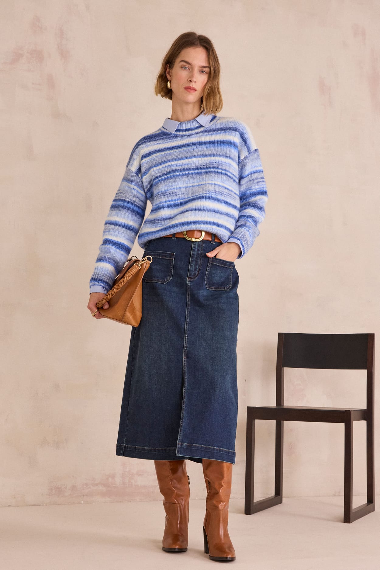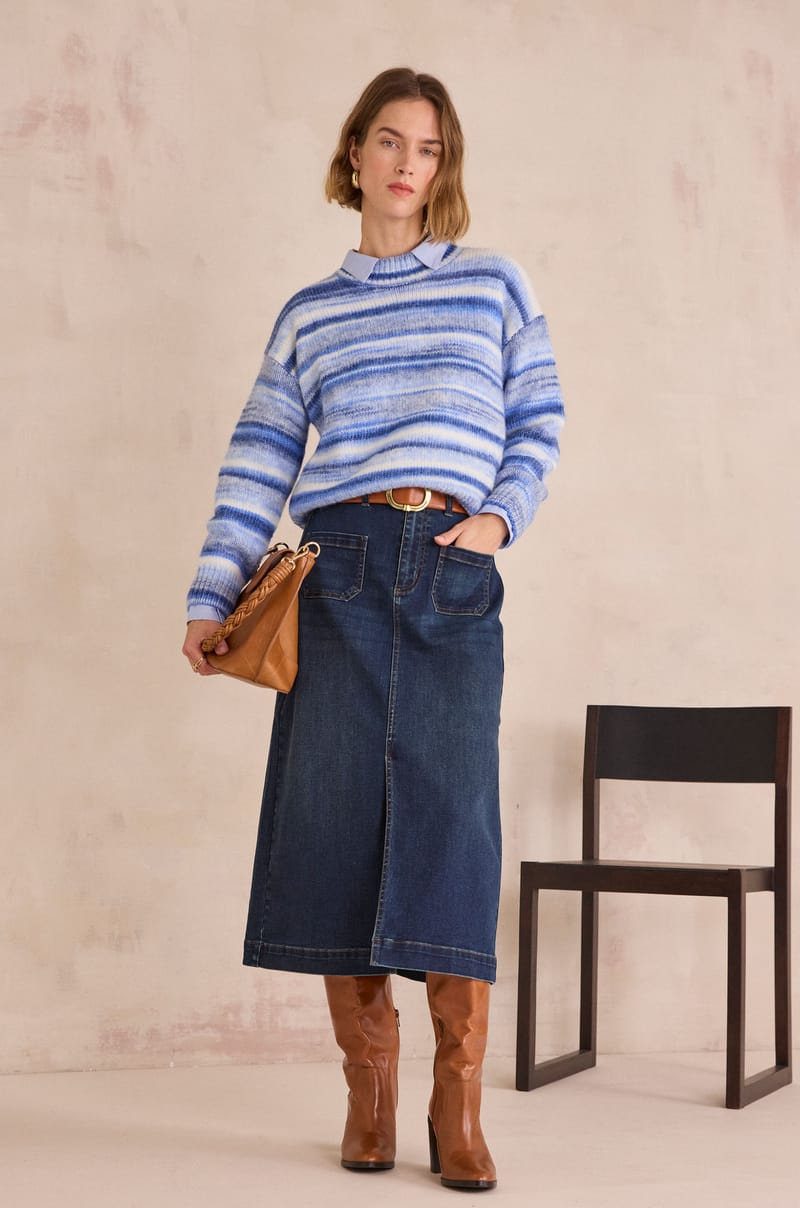 OXANE pleated denim midi skirt;${refinementColor}